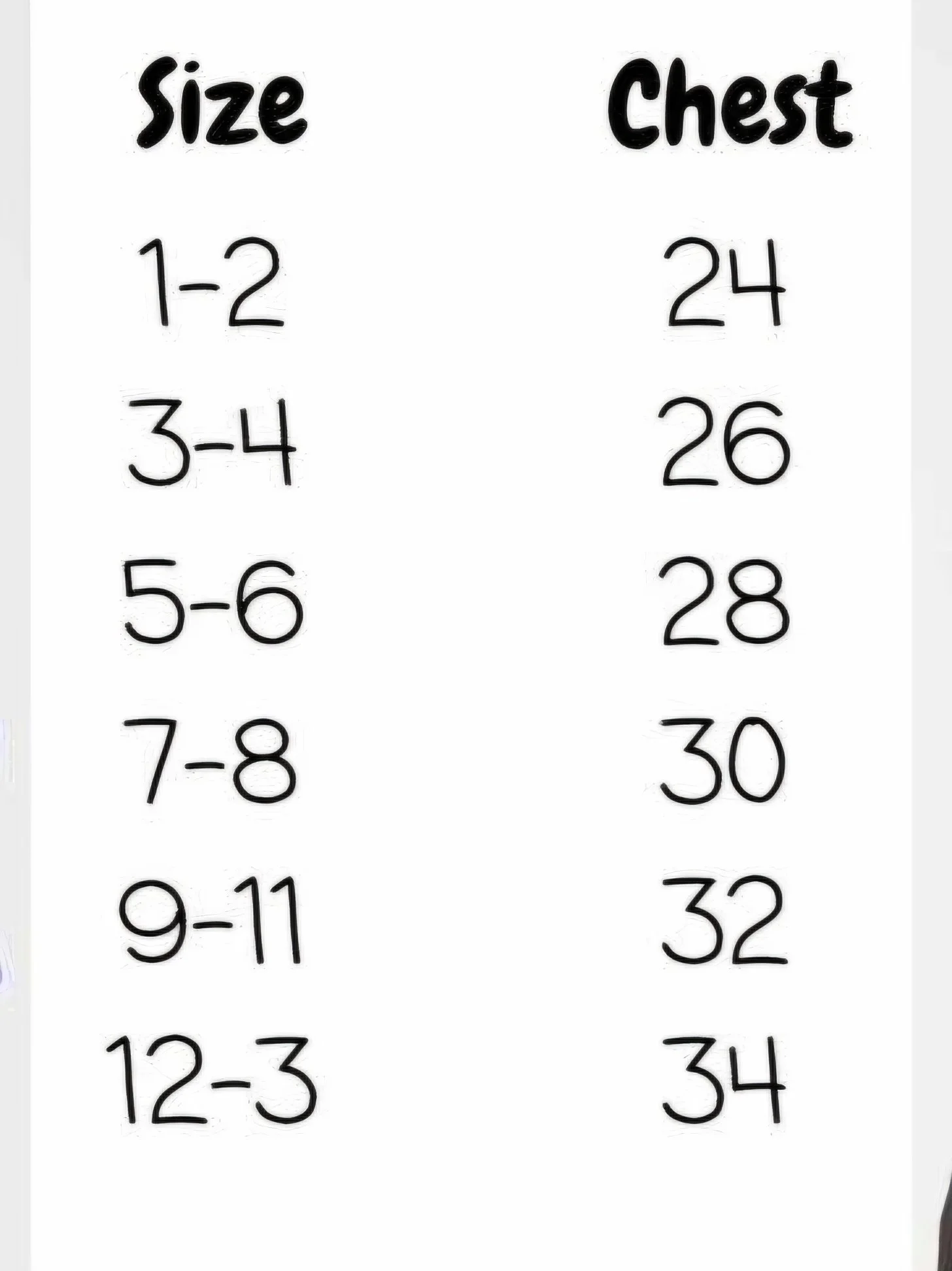 Size chart shown in the photos above